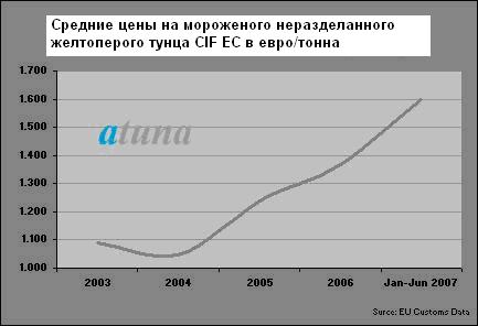 По данным торговой статистики ЕС, средняя импортная цена на мороженого неразделанного желтоперого тунца в течение первой половины этого года выросла на 16% до 1597 евро/тонна с 1367 евро/тонна в том же периоде 2006 года. При сегодняшнем курсе евро-доллар это означает цену в 2290 долл/тонна CIF европейские порты.