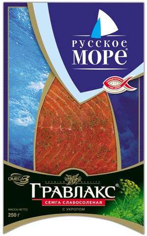 «Гравлакс» (от Gravad Lax) - слабосоленый или подкопченный лосось, маринованный с пряными травами и специями по традиционной шведской рецептуре. Технология гравлакс популярна на Западе, но широко в России не используется. Ассортиментный ряд «Гравлакс» компании «Русское море» включает в себя шесть позиций, ни одна из которых ранее не была представлена на российском рынке: