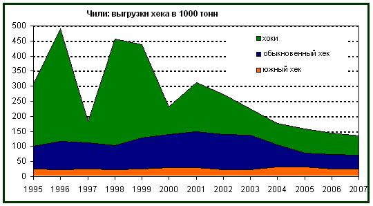 В 2007 году выгрузки хека (включая хоки (макруронуса)) в Чили составили 134.793 тонны, что на 7,2% меньше относительно 2006 года, кода объем выгрузок составил 145.280 тонн. Эти данные говорят о том, что в 2007 году производство хека оказалось самым низким за последние десять лет, причем выгрузки снижались, начиная с 2001 года. Главным добываемым видом остается хоки (Macruronus magellanicus). Выгрузки этого вида в 2007 году составили 63.739 тонн, или 47% от всего объема, далее идет обыкновенный хек (Merluccius gayi) с 45.591 тонной (34%), в то время как остальные 19% пришлись на южного хека (в ТН ВЭД проходит как новозеландская мерлуза) (Merluccius australis), выгрузки которого составили 25.463 тонны. С 2001 года (как видно в диаграмме ниже) самое большое падение выгрузок произошло по хоки.