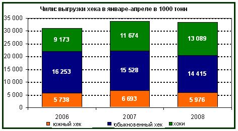 В январе-апреле 2008 года чилийский экспорт хека сократился, как по объему, так и по стоимости относительно того же периода 2007 года с 9.481 тонны на сумму 27,9 млн. долл в январе-марте 2007 года до 7.941 тонны на сумму 27,4 млн. долл в тот же периода 2008 года. Снижение объема составило 16%, в то время как стоимость снизилась всего на 2%. Это произошло вследствие 17% роста цен.