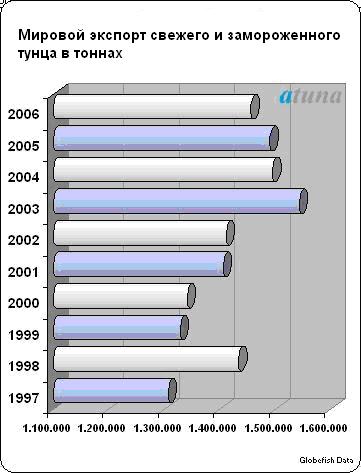 В диаграмме, отображающей объем экспорта с 1997 по 2006 гг, видно, что пик экспорта тунца пришелся на 2003 год. Общий объем поставок в этот год составил 1.543.400 тонн. С этого момента экспорт начал снижаться. В 2006 году мировые поставки упали на 6% относительно уровня 2003 года.