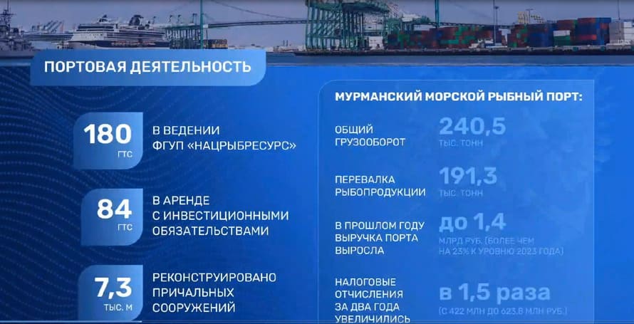 Руководитель Росрыболовства также особо отметил работу Мурманского морского рыбного порта (ММРП), возвращенного в государственную собственность под управление Росрыболовства. Так, порт стабильно работает, ведется строительство нового логистического комплекса. По итогам 2025 года перевалка рыбопродукции составила свыше 191 тысячи тонн, выручка ММРП выросла до 1,4 млрд рублей, налоговые отчисления за два года увеличились в 1,5 раза.