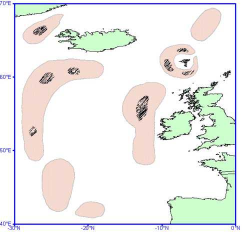 Рис 1. Районы, перспективные для освоения глубоководных объектов промысла в Северной Атлантике. Заштрихованы участки, обследованные судами ЗАО НПП «Вега».
