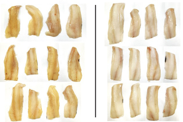 - треска не желтеет по сравнению с пикшей в идеальных условиях, но это возможно в зависимости от состояния сырья.