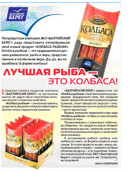 ЗАО «Балтийский Берег» представило на рынок новинку - «Рыбную колбасу», Об этом сообщает www.fishnet.ru со ссылкой на газету петербургское качество.