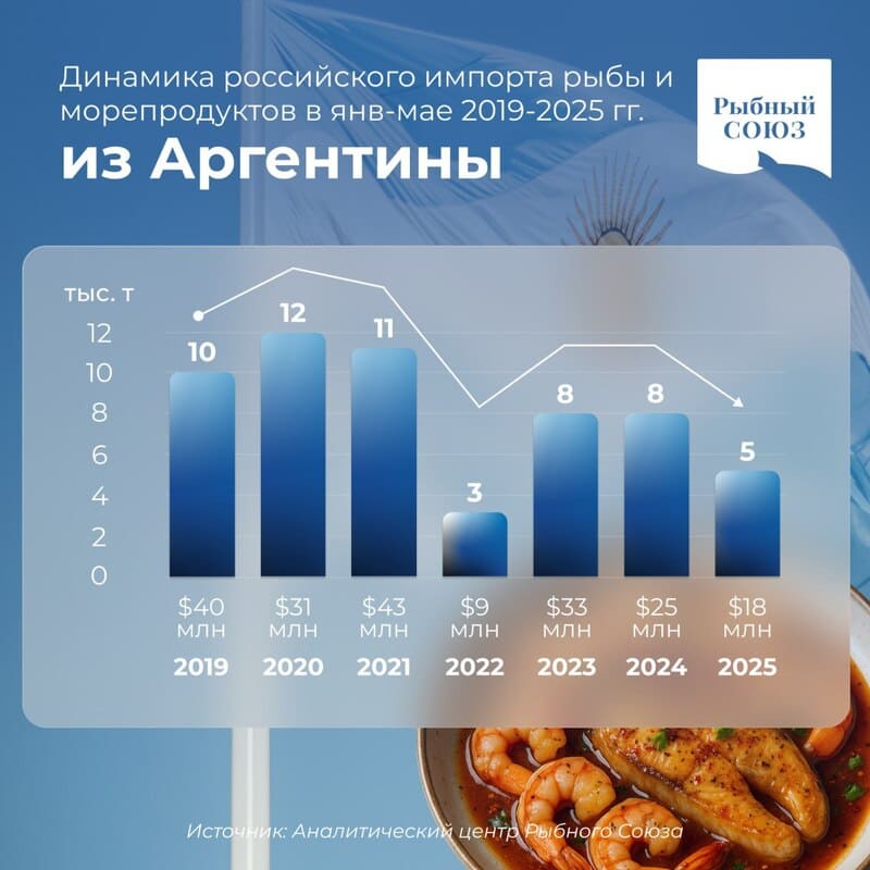 В январе-мае 2025 года российский импорт рыбы и морепродуктов из Аргентины снизился (год к году) на 35% в весе − до 5 тыс. тонн и на 30% в деньгах − до $18 млн, подсчитал Аналитический центр Рыбного союза на основе данных Европейской службы мониторинга рынка рыболовства и аквакультуры.