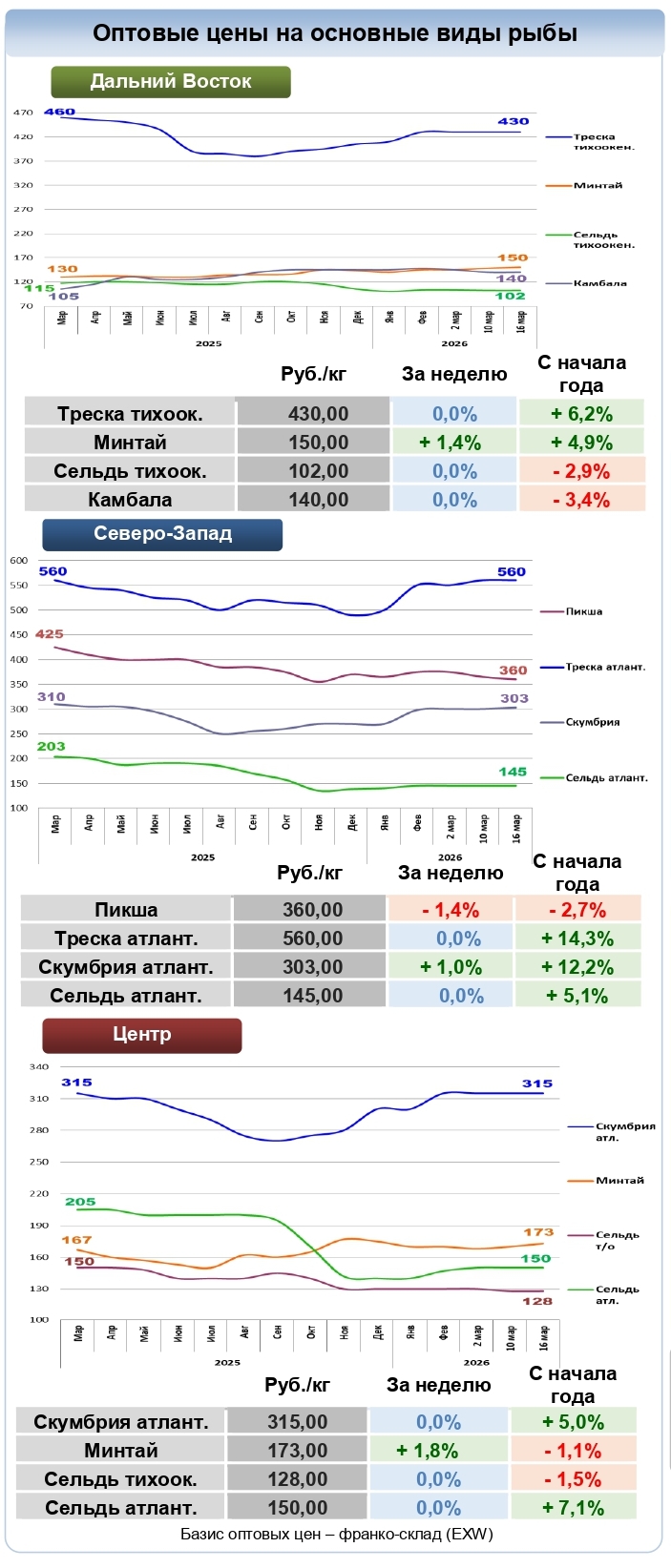 За прошедший период с 10 по 15 марта 2026 года динамика цен на мороженую рыбу в оптовом сегменте внутреннего рынка демонстрировала, в основном, тенденцию к стабильности.