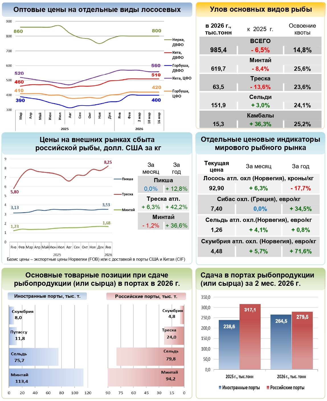 В этом обзоре: Мониторинг оптовых цен на основные виды рыбы (ДВ, Северо-Запад, Центр), на отдельные виды лососёвых. Обзор цен на внешних рынках сбыта российской рыбы. Обзор основных товарных позиций при сдаче рыбопродукции (или сырца) в портах 2026г. Отдельные ценовые индикаторы мирового рыбного рынка.