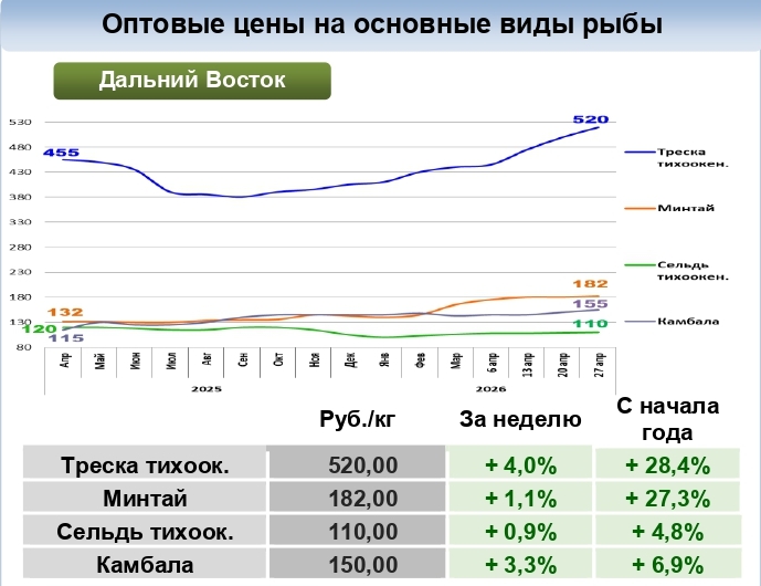 На прошедшей неделе с 20 по 27 апреля 2026 года цены на мороженую рыбу в оптовом сегменте внутреннего рынка демонстрировали разнонаправленные тенденции.