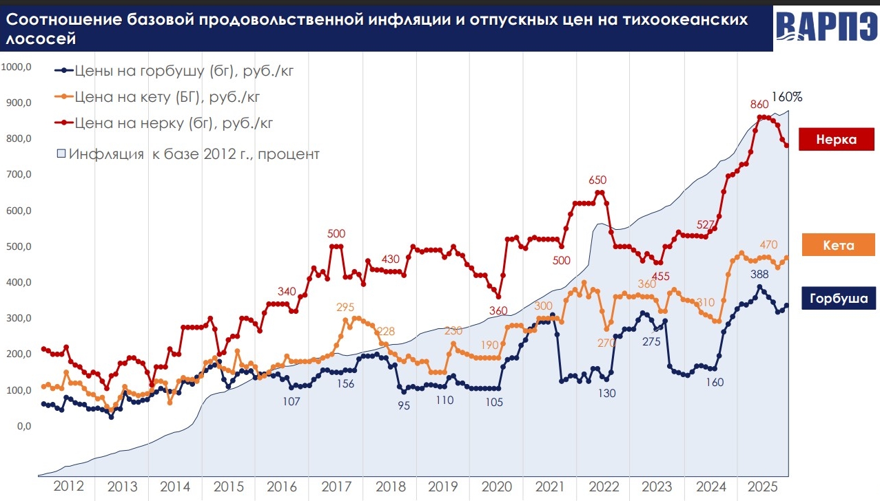 Динамика отпускных цен на замороженных тихоокеанских лососей в 2018-2025 годы существенно отстаёт от темпов базовой продовольственной инфляции: с 2018 года заметно для горбуши и кеты, с 2022 — для нерки.