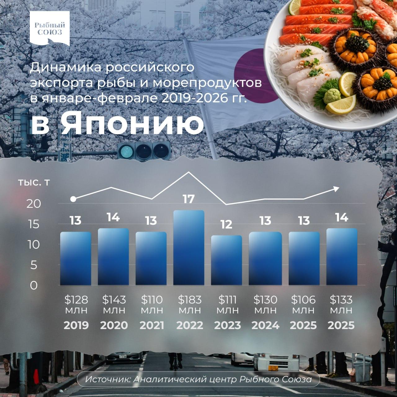 В январе-феврале 2026 года российский экспорт рыбы и морепродуктов в Японию вырос (год к году) на 9% в весе и на 25% в деньгах, до 14,4 тыс. тонн на сумму $132,6 млн, по данным японской таможенной статистики.