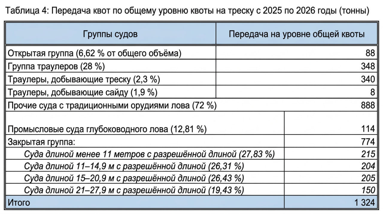 Оставшиеся объемы — 1 324 тонны трески и 1 193 тонны пикши — будут распределены между всеми группами в соответствии со стандартными пропорциональными долями квот.